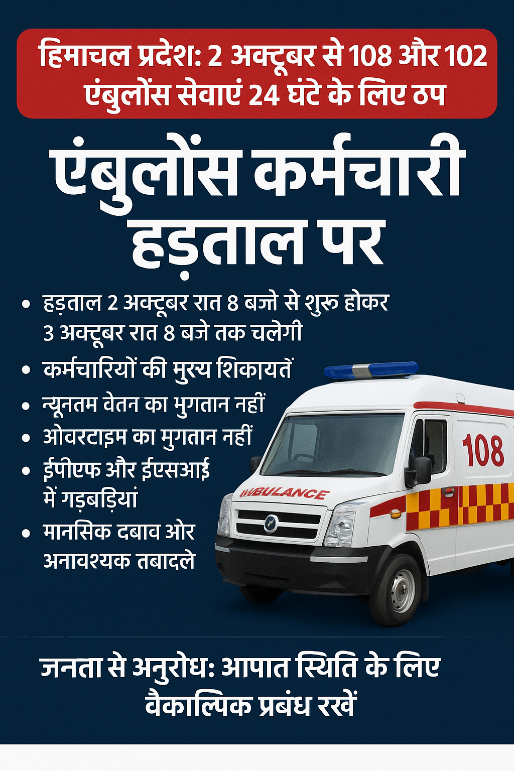 हिमाचल प्रदेश में 2 अक्टूबर से 108 और 102 एंबुलेंस सेवाएं हड़ताल के कारण बाधित रहेंगी। कर्मचारी यूनियनों ने न्यूनतम वेतन नहीं मिलने और कार्यस्थल पर अन्य समस्याओं के विरोध में 24 घंटे की हड़ताल का ऐलान किया है। इसका असर आम जनता पर पड़ेगा और आपातकालीन एंबुलेंस सेवाएं अस्थायी रूप से उपलब्ध नहीं रहेंगी।