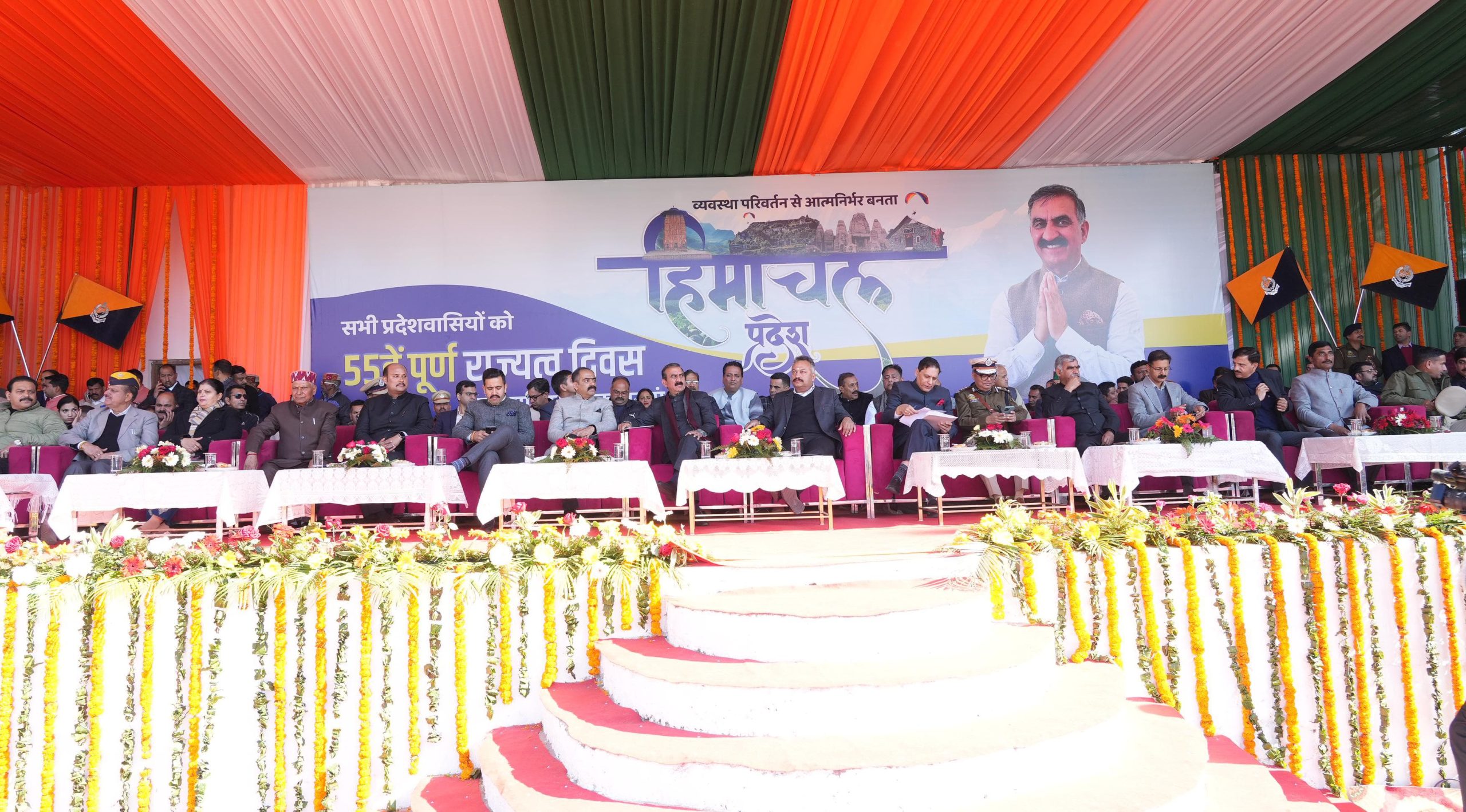 मुख्यमंत्री ठाकुर सुखविंद्र सिंह सुक्खू ने आज कांगड़ा जिले के बैजनाथ में आयोजित 55वें पूर्ण राज्यत्व दिवस समारोह के दौरान हिमाचल प्रदेश के लोगों को शुभकामनाएं दीं। उन्होंने राज्यत्व दिवस के अवसर पर पूर्व प्रधानमंत्री इंदिरा गांधी और हिमाचल प्रदेश के पहले मुख्यमंत्री डा. वाई. एस. परमार के अपार योगदान को याद किया। मुख्यमंत्री ने राष्ट्रीय ध्वज फहराया और पुलिस, होमगार्ड, आईआरबी बस्सी, आईआरबी सकोह, एसएसबी सपरी, जिला पुलिस कांगड़ा, यातायात पुलिस, एनसीसी कैडेट्स, स्काउट्स एंड गाइड्स और पुलिस बैंड की टुकड़ियों की सलामी ली। परेड कमांडर आईपीएस (प्रोबेशनर) रविनंदन के नेतृत्व में शानदार मार्च पास्ट प्रस्तुत किया गया।