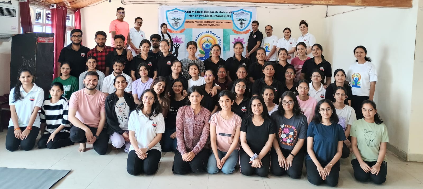 शिमला। राजकीय दंत महाविद्यालय एवं चिकित्साल्य में 21 जून को कॉलेज का तीसरा अन्तर्राष्ट्रीय योग दिवस मनाया गया । जिसमें आयुष हेल्थ सेंटर के प्रशिक्षक मनीषा द्वारा एक घंटे का योग सेशन किया गया ,जो कि सुबह 7 :30से 8 :30 बजे तक हुआ। इस सेशन में कॉलेज के प्रधानाचार्य डॉ. आशु गुप्ता , डॉ.आशीष , डॉ. पुष्पलता, डॉ.अर्चना, डॉ. मनीष , डॉ.पारुल और लगभग 50 छात्रों ने भाग लिया।सेशन के दौरान सभी ने शांति और सकारात्मकता का अहसास किया अतः अंत में प्रधानाचार्या द्वारा योग प्रशिक्षक मनीषा जी को सम्मानित किया गया अथवा सभी भागियों को जलपान और टी शर्ट्स बांटी गई।अन्तर्राष्ट्रीय योग दिवस का आयोजन अटल मैडिकल रिसर्च यूनिवर्सिटी, नेर चौक मंडी द्वारा किया गया।