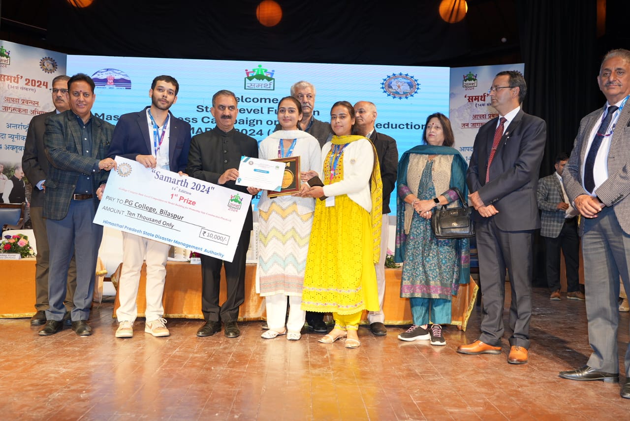 उन्होंने विभिन्न प्रतियोगिताओं के विजेता बच्चों को सम्मानित किया और इस मॉनसून के दौरान समेज, बागीपुल, राजबन में बादल फटने की घटनाओं के दौरान किए गए असाधारण राहत कार्यों के लिए विभिन्न व्यक्तियों को सम्मानित भी किया।मुख्यमंत्री ने आपदा तैयारी और प्रतिक्रिया हेतु युवा स्वयंसेवियों की टास्क फोर्स के लिए जिला कांगड़ा और चम्बा को ‘सर्वोत्तम प्रदर्शन करने वाले जिला’ पुरस्कार से सम्मानित किया।