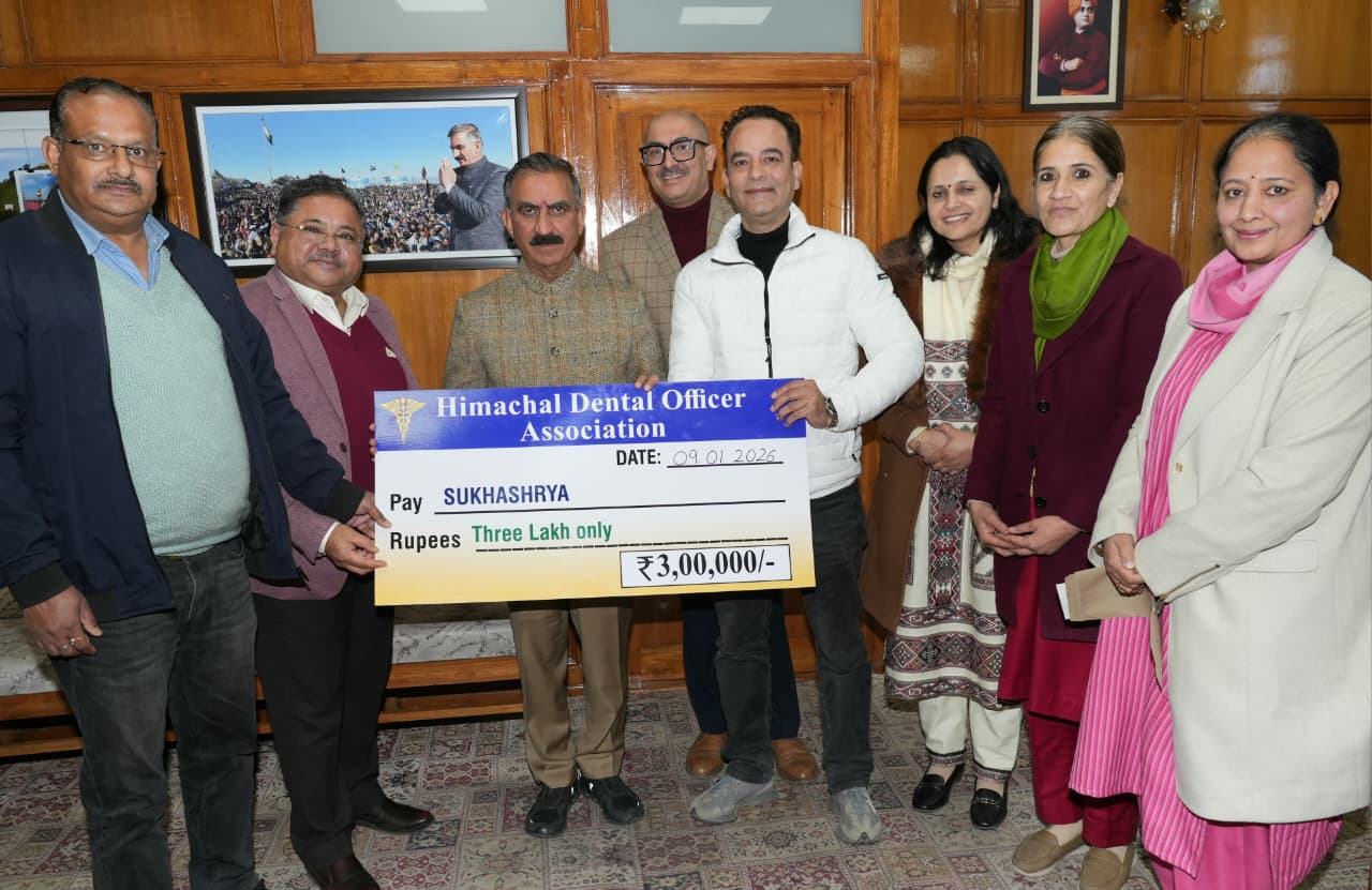 हिमाचल प्रदेश डेंटल काउंसिल और एचपी डेंटल ऑफिसर ऐसोसिएशन ने मुख्यमंत्री ठाकुर सुखविन्द्र सिंह सुक्खू को सुख आश्रय कोष के लिए पांच लाख रुपये और मुख्यमंत्री राहत कोष के लिए तीन लाख रुपये के चेक भेंट किए।